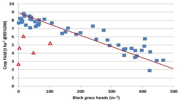 Source: AHDB Project Report No. 560 July 2016 Sustaining winter cropping under threat from herbicide resistant black-grass Red triangles = outlier values due to poor crop establishment.